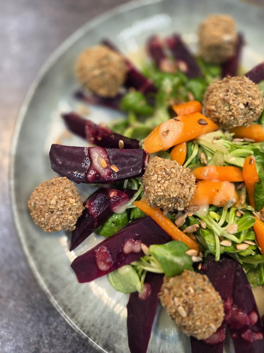 • Előétel: sajtgolyó, körtés vinegrette öntettel, saláta ágyon (cékla, répa, saláta)